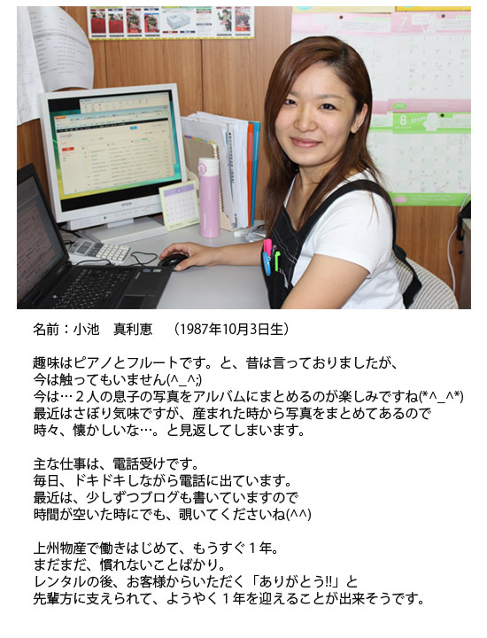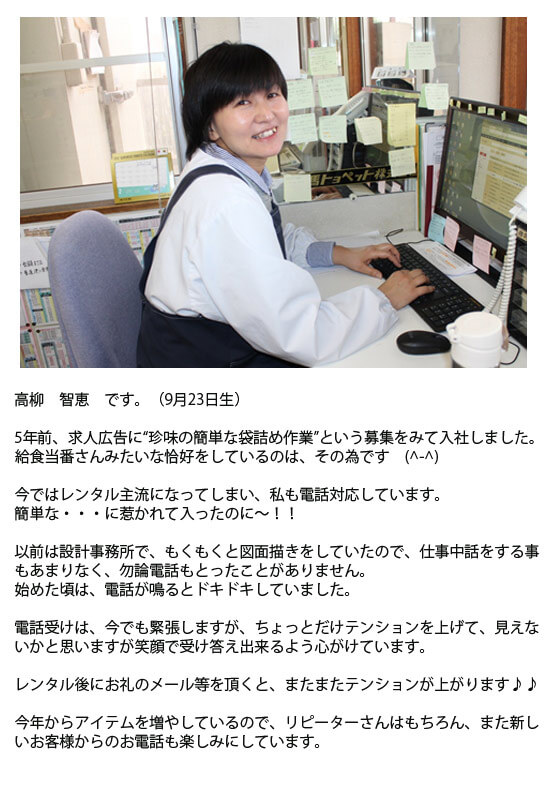 主な仕事は、電話受けです。 毎日、ドキドキしながら電話に出ています。 最近は、少しづつブログも書いていますので時間が空いた時にでも、覗いてくださいね(^^)