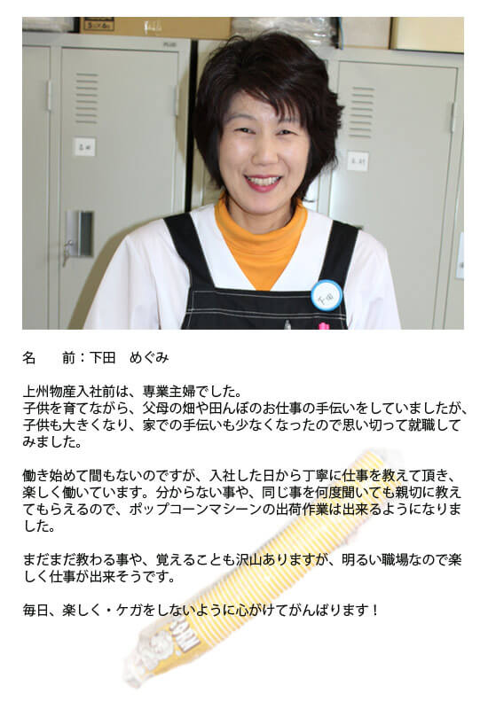 分からない事や、同じ事を何度聞いても親切に教えてもらえるので、ポップコーンの出荷作業は出来るようになりました。