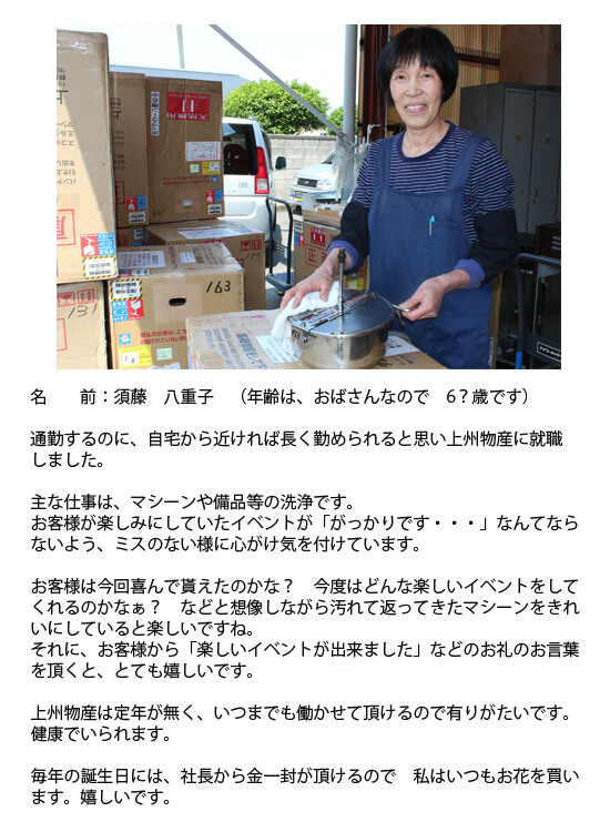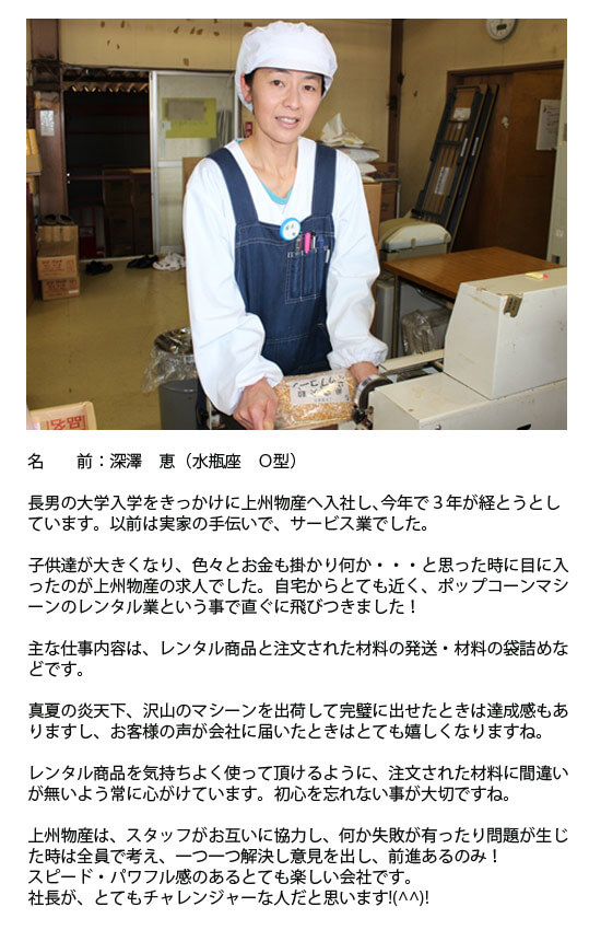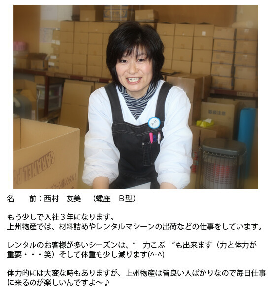 上州物産では、材料詰めやレンタルマシーンの出荷などの仕事をしています。レンタルのお客様が多いシーズンは、“力こぶ”も出来ます(力と体力が重要・・・笑)そして体重も少し減ります(^-^)