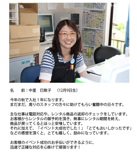 全国の方々と、話しが出来る事やレンタル終了後のお礼のお言葉やイベント大成功のお客様の声を頂いた時は、とても嬉しいです。