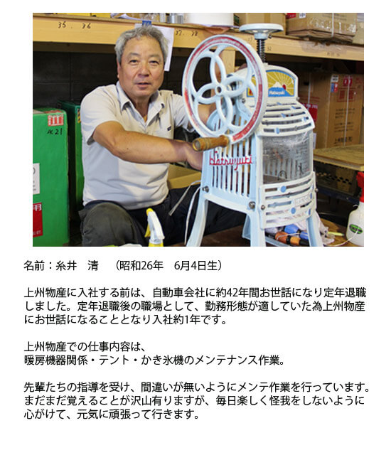 上州物産での仕事内容は、 暖房機器関係・テント・カキ氷機のメンテナンス作業。