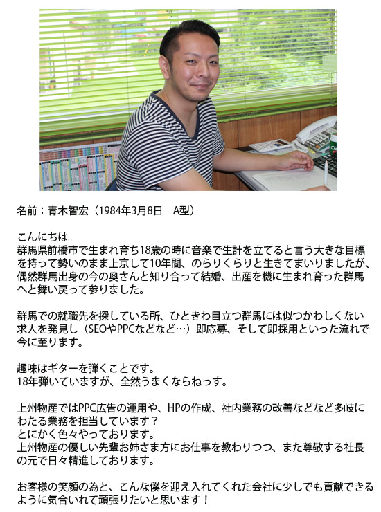 群馬での就職先を探している所、ひときわ目立つ群馬には似つかわしくない求人を発見し(SEOやPPCなどなど・・・)即応募、そして即採用といった流れで今に至ります。