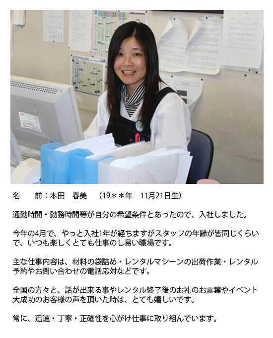 主な仕事内容は、材料の袋詰め・レンタルマシーンの出荷作業・レンタル予約やお問い合わせの電話対応などです。