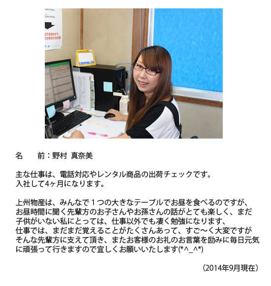 今回、「上州物産」に入社致しました。 仕事は、レンタル商品の整備で、毎日が勉強の日々です。