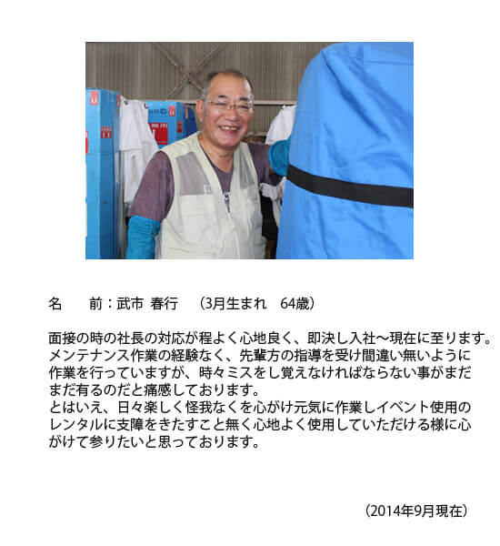 お客様が気持ちよくレンタル品を使用していただける様に、十分注意して業務を行って行きたいと思っています。