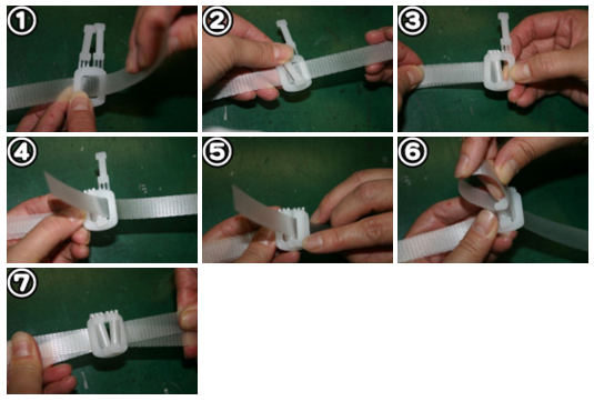 ※上段の写真1~3の順番に片側を留めて頂き、次に下段写真4~7の順番にもう一方を留めてください。