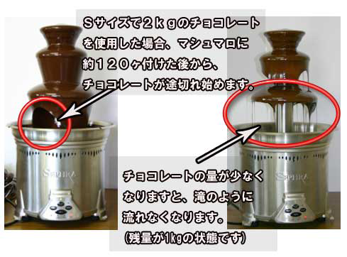 チョコレートが噴水のように切れ目なく「流れるのに必要な量」は、Sサイズが約2㎏。Lサイズが約4kg。XLサイズが約8㎏です